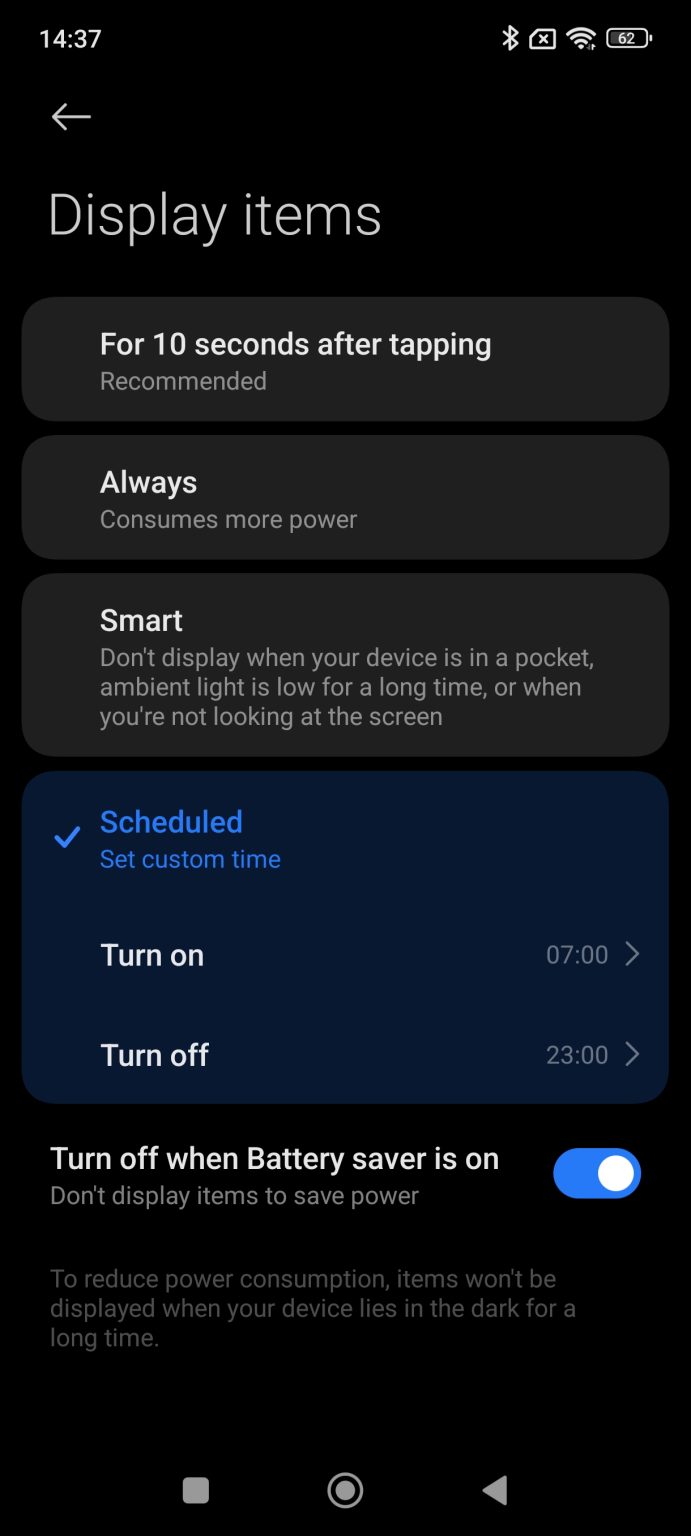 در انتهای همین بخش، گزینهای با عنوان “Turn off when Battery saver is on” تعبیه شده است. با فعالسازی این ویژگی، به دستگاه دستور میدهید که هنگام فعال بودن حالت ذخیره باتری و خاموش شدن صفحه نمایش، قابلیت “Always on Display” غیرفعال گردد. این اقدام به منظور بهینهسازی مصرف انرژی و جلوگیری از کاهش بیرویه شارژ باتری صورت میپذیرد. به این ترتیب، زمانی که اولویت با حفظ شارژ باتری باشد و صفحه نمایش خاموش شود، دیگر نیازی به روشن ماندن دائمی بخش هایی از آن نخواهد بود. این تنظیمات هوشمندانه به کاربران امکان میدهد تا بسته به شرایط و نیاز خود، بین نمایشگر همیشه روشن و مصرف بهینه باتری، انتخاب نمایند.